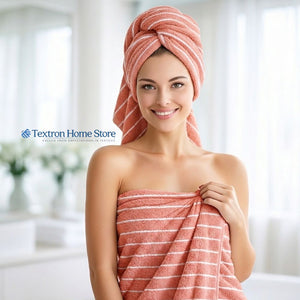 Supima cotton’s extra-long staple fibers create a smoother, stronger fabric that resists pilling and maintains its plush feel wash after wash. The elegant coral base with refined white stripe detailing adds a modern, hotel-style touch to any bathroom.